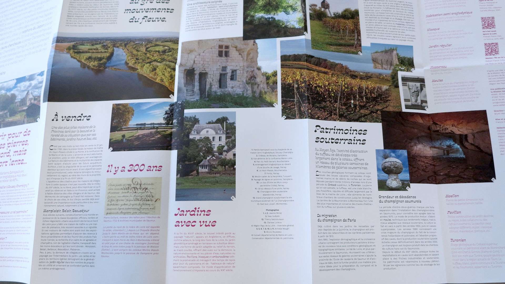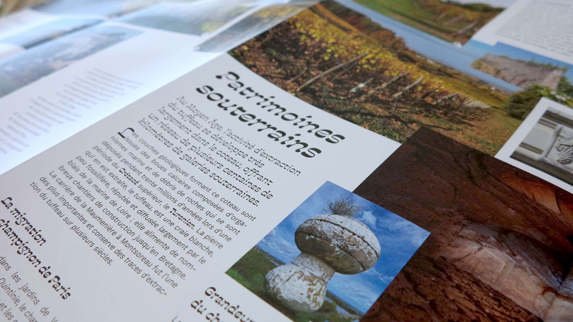 Ainsi, au fil de votre lecture, vous parcourrez les paysages de l'Anjou blanc caractérisés par la roche tendre et blonde du Bassin parisien : habitat troglodytique, maisons de maître et de villégiature, jardins avec vue sur Loire, vignes sur le plateau, champignonnières dans le coteau excavé...