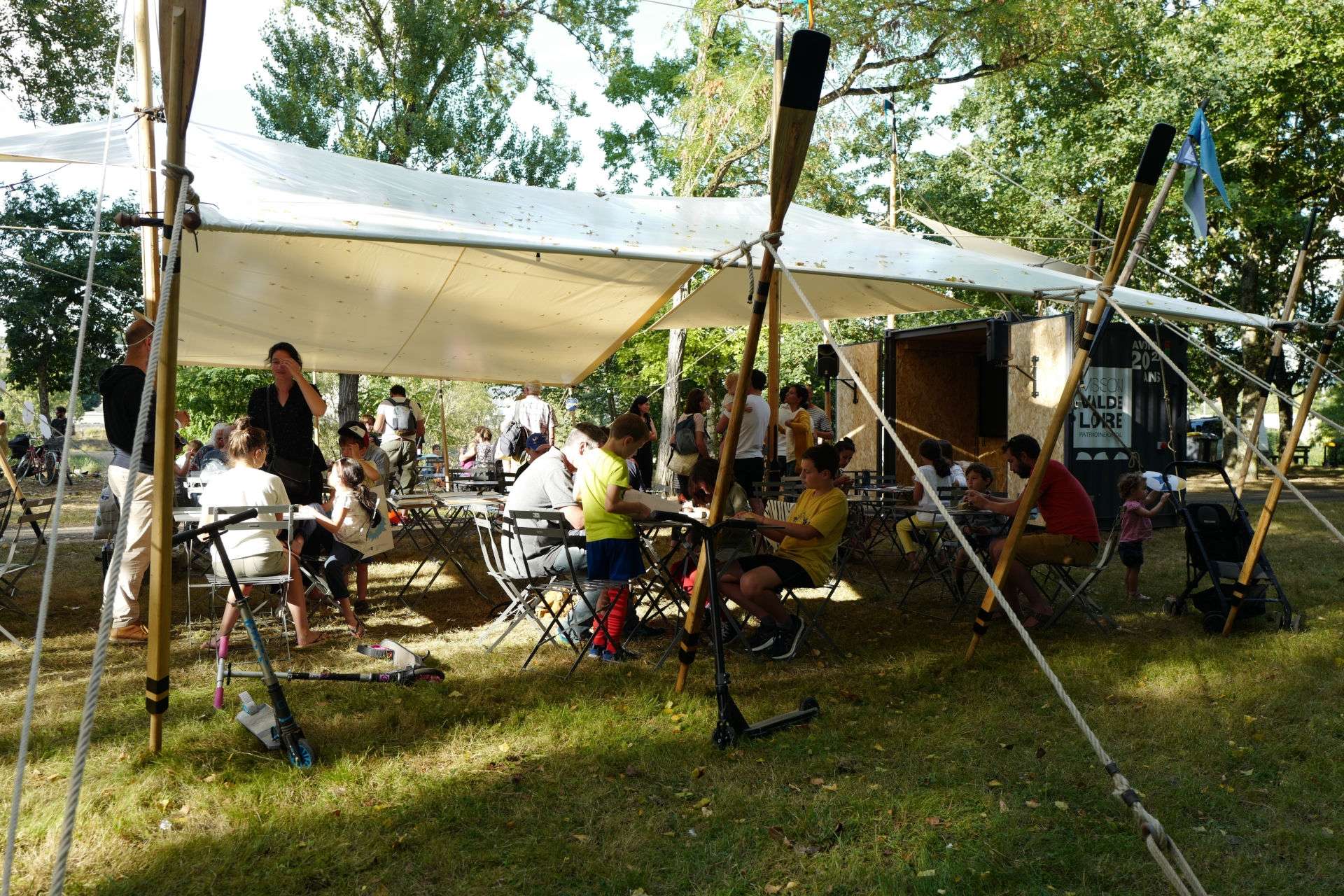 Le campement imaginé pour les escales a été pensé en lien avec la batellerie de Loire : des conteneurs maritimes évoquant le transport de marchandises sur la Loire et des toiles tendues comme sur les campements de mariniers.